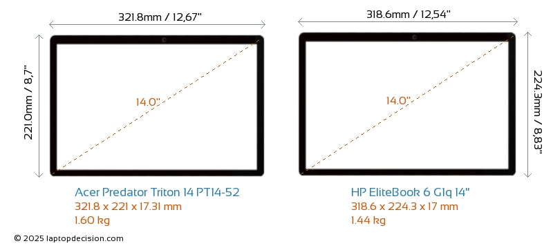 HDMIBoth Predator Triton 14 PT14-52 and EliteBook 6 G1q 14" feature an HDMI port (1x HDMI 2.1) for connecting to external monitors.