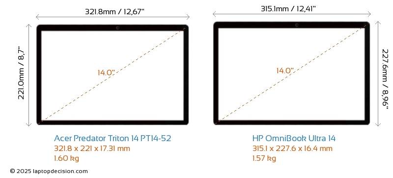 HDMI Predator Triton 14 PT14-52 features an HDMI port (1x HDMI 2.1) for connecting to external monitors. OmniBook Ultra 14 does not have an HDMI port.