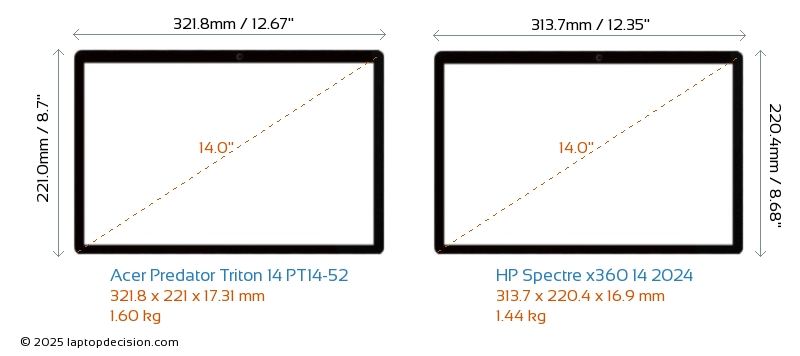 HDMI Predator Triton 14 PT14-52 features an HDMI port (1x HDMI 2.1) for connecting to external monitors. Spectre x360 14 2024 does not have an HDMI port.