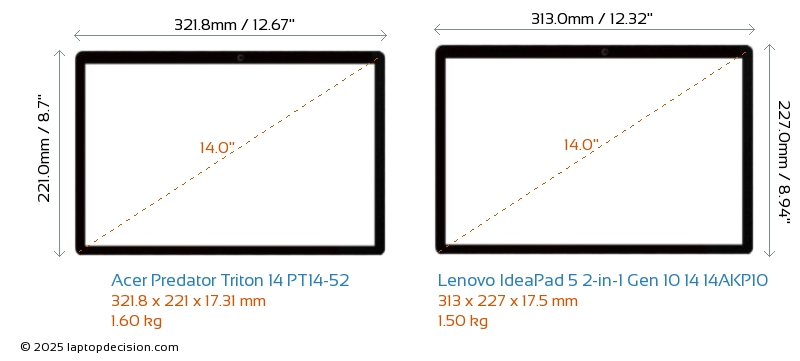 HDMIBoth Predator Triton 14 PT14-52 and IdeaPad 5 2-in-1 Gen 10 14 14AKP10 feature an HDMI port. Predator Triton 14 PT14-52 offers 1x HDMI 2.1, while IdeaPad 5 2-in-1 Gen 10 14 14AKP10 offers 1x HDMI 1.4.