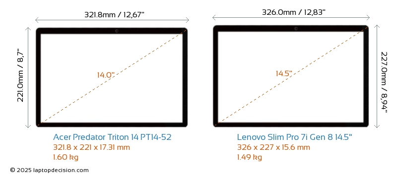 HDMIBoth Predator Triton 14 PT14-52 and Slim Pro 7i Gen 8 14.5" feature an HDMI port. Predator Triton 14 PT14-52 offers 1x HDMI 2.1, while Slim Pro 7i Gen 8 14.5" offers 1x HDMI 2.0.