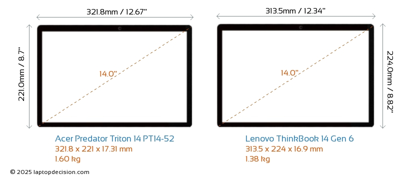 USBBoth Predator Triton 14 PT14-52 and ThinkBook 14 Gen 6 feature 2x USB 3.2 USB-A ports.Both Predator Triton 14 PT14-52 and ThinkBook 14 Gen 6 feature 2x USB 3.2 USB Type-C ports.