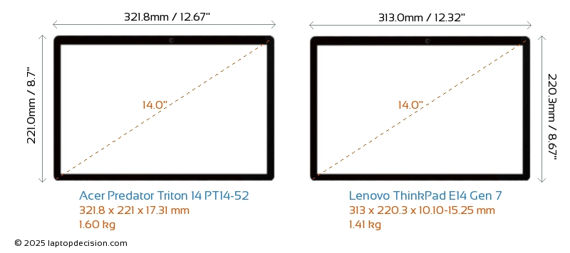 USBBoth Predator Triton 14 PT14-52 and ThinkPad E14 Gen 7 feature 2x USB 3.2 USB-A ports.Both Predator Triton 14 PT14-52 and ThinkPad E14 Gen 7 have USB Type-C ports. Predator Triton 14 PT14-52 has 2x USB 3.2 USB Type-C ports, while ThinkPad E14 Gen 7 has 2x USB 4.0 USB Type-C ports.