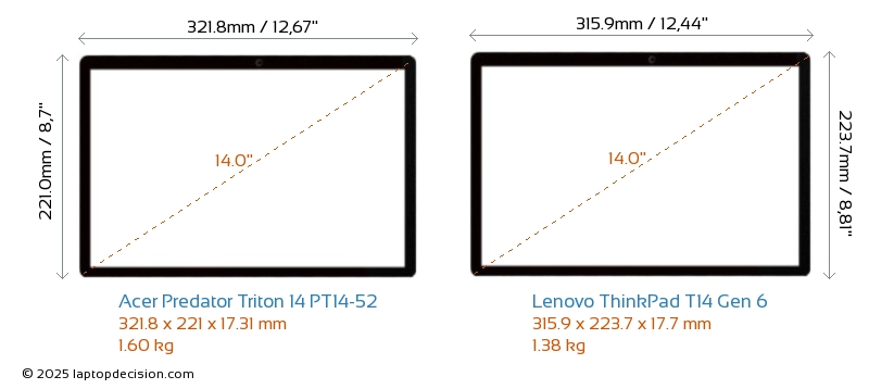 ThunderboltBoth Predator Triton 14 PT14-52 and ThinkPad T14 Gen 6 are equipped with Thunderbolt 4 ports.