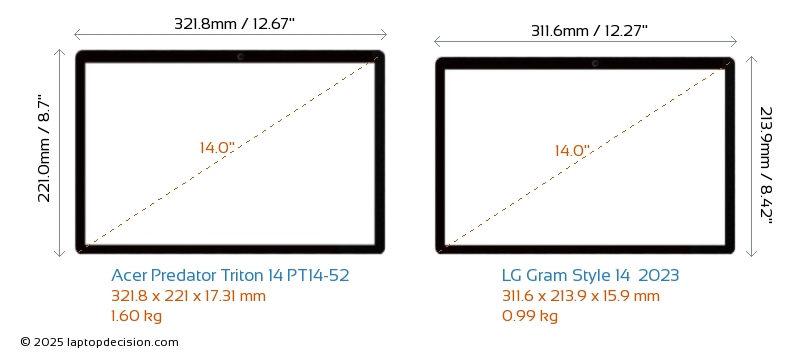HDMI Predator Triton 14 PT14-52 features an HDMI port (1x HDMI 2.1) for connecting to external monitors. Gram Style 14 2023 does not have an HDMI port.