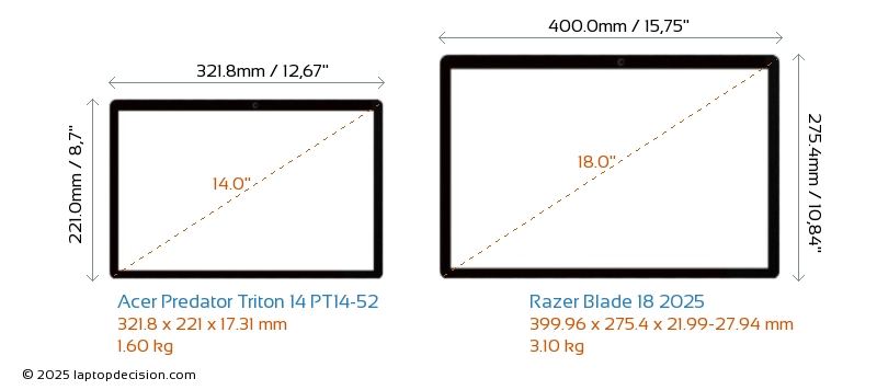 USBBoth Predator Triton 14 PT14-52 and Blade 18 2025 have USB-A ports. Predator Triton 14 PT14-52 has 2x USB 3.2 USB-A ports, while Blade 18 2025 has 3x USB 3.2 USB-A ports.Both Predator Triton 14 PT14-52 and Blade 18 2025 have USB Type-C ports. Predator Triton 14 PT14-52 has 2x USB 3.2 USB Type-C ports, while Blade 18 2025 has 2x USB 4.0 USB Type-C ports.