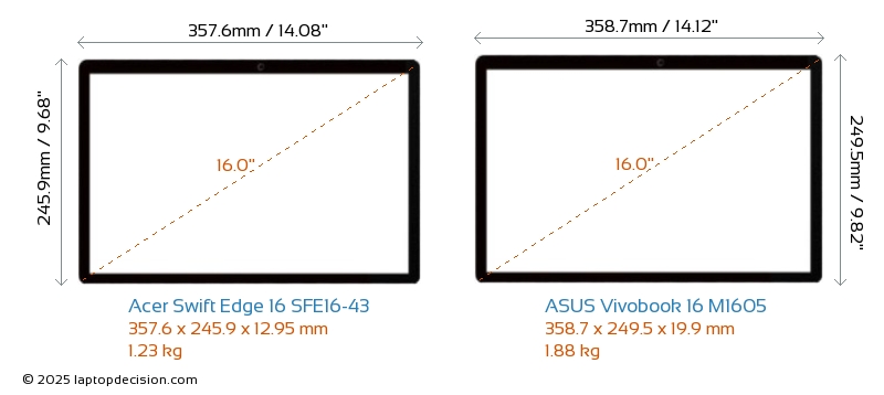 HDMIBoth Swift Edge 16 SFE16-43 and Vivobook 16 M1605 feature an HDMI port. Swift Edge 16 SFE16-43 offers 1x HDMI 2.1, while Vivobook 16 M1605 offers 1x HDMI 1.4.