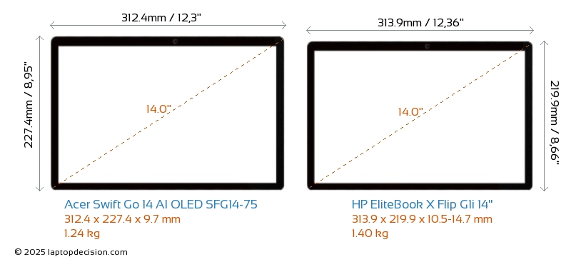 USBBoth Swift Go 14 AI OLED SFG14-75 and EliteBook X Flip G1i 14" have USB-A ports. Swift Go 14 AI OLED SFG14-75 has 2x USB 3.2 USB-A ports, while EliteBook X Flip G1i 14" has 1x USB 3.2 USB-A ports.Both Swift Go 14 AI OLED SFG14-75 and EliteBook X Flip G1i 14" have USB Type-C ports. Swift Go 14 AI OLED SFG14-75 has 2x USB 4.0 USB Type-C ports, while EliteBook X Flip G1i 14" has 3x USB 4.0 USB Type-C ports.
