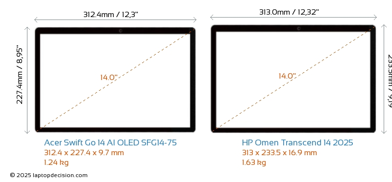 HDMIBoth Swift Go 14 AI OLED SFG14-75 and Omen Transcend 14 2025 feature an HDMI port (1x HDMI 2.1) for connecting to external monitors.