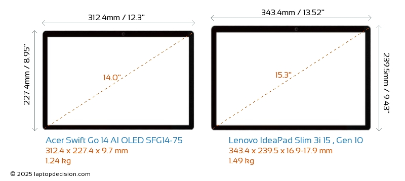 USBBoth Swift Go 14 AI OLED SFG14-75 and IdeaPad Slim 3i 15 , Gen 10 feature 2x USB 3.2 USB-A ports.Both Swift Go 14 AI OLED SFG14-75 and IdeaPad Slim 3i 15 , Gen 10 have USB Type-C ports. Swift Go 14 AI OLED SFG14-75 has 2x USB 4.0 USB Type-C ports, while IdeaPad Slim 3i 15 , Gen 10 has 1x USB 3.2 USB Type-C ports.
