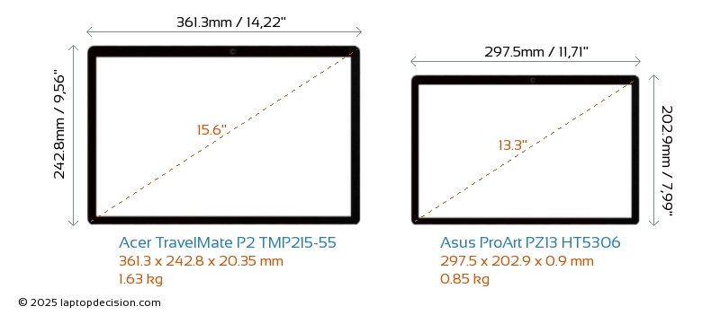HDMI TravelMate P2 TMP215-55 features an HDMI port (1x HDMI 2.1) for connecting to external monitors. ProArt PZ13 HT5306 does not have an HDMI port.