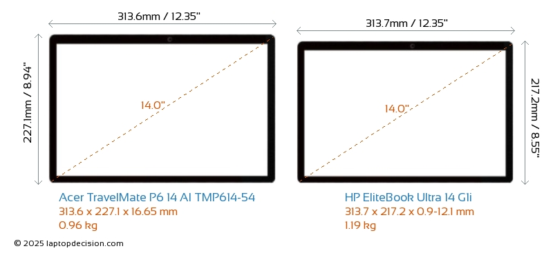 HDMI TravelMate P6 14 AI TMP614-54 features an HDMI port (1x HDMI 2.1) for connecting to external monitors. EliteBook Ultra 14 G1i does not have an HDMI port.