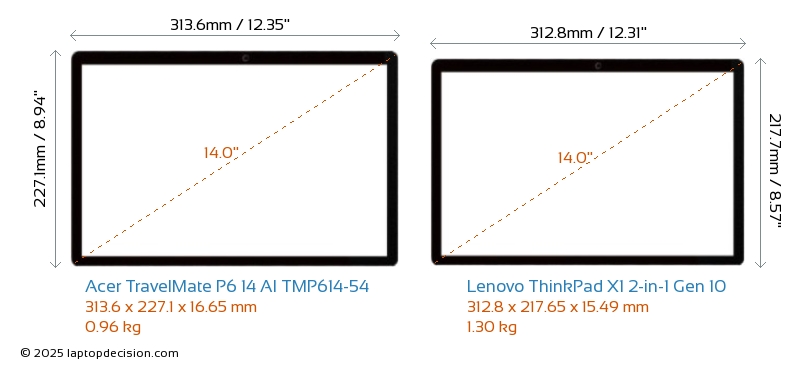 USBBoth TravelMate P6 14 AI TMP614-54 and ThinkPad X1 2-in-1 Gen 10 feature 2x USB 3.2 USB-A ports.Both TravelMate P6 14 AI TMP614-54 and ThinkPad X1 2-in-1 Gen 10 feature 2x USB 4.0 USB Type-C ports.