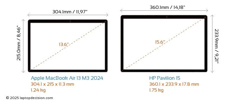 HDMI Pavilion 15 features an HDMI port (1x HDMI 2.0) for connecting to external monitors. MacBook Air 13 M3 2024 does not have an HDMI port.