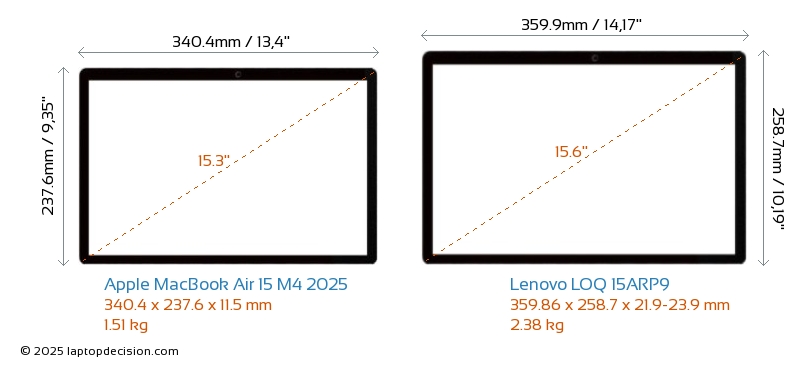 USB LOQ 15ARP9 is equipped with 3x USB 3.2 USB-A ports. MacBook Air 15 M4 2025 does not have USB-A ports.Both MacBook Air 15 M4 2025 and LOQ 15ARP9 have USB Type-C ports. MacBook Air 15 M4 2025 has 2x USB 4.0 USB Type-C ports, while LOQ 15ARP9 has 1x USB 3.2 USB Type-C ports.