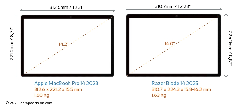 HDMIBoth MacBook Pro 14 2023 and Blade 14 2025 feature an HDMI port (1x HDMI 2.1) for connecting to external monitors.