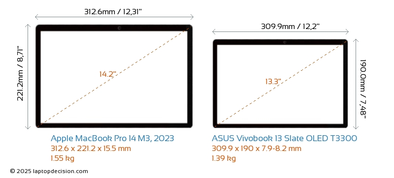 Audio JackBoth MacBook Pro 14 M3, 2023 and Vivobook 13 Slate OLED T3300 are equipped with a 3.5mm Audio Jack, providing seamless connection to headphones and speakers.