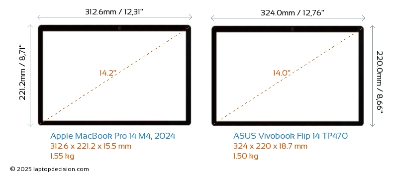 Audio JackBoth MacBook Pro 14 M4, 2024 and Vivobook Flip 14 TP470 are equipped with a 3.5mm Audio Jack, providing seamless connection to headphones and speakers.