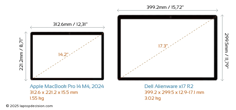 Audio JackBoth MacBook Pro 14 M4, 2024 and Alienware x17 R2 are equipped with a 3.5mm Audio Jack, providing seamless connection to headphones and speakers.