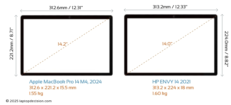 HDMIBoth MacBook Pro 14 M4, 2024 and ENVY 14 2021 feature an HDMI port. MacBook Pro 14 M4, 2024 offers 1x HDMI 2.1, while ENVY 14 2021 offers 1x HDMI 2.0.