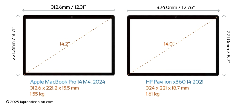 Audio JackBoth MacBook Pro 14 M4, 2024 and Pavilion x360 14 2021 are equipped with a 3.5mm Audio Jack, providing seamless connection to headphones and speakers.