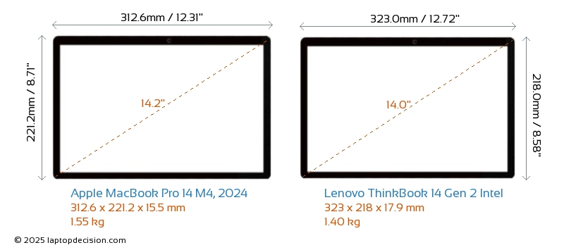 HDMIBoth MacBook Pro 14 M4, 2024 and ThinkBook 14 Gen 2 Intel feature an HDMI port. MacBook Pro 14 M4, 2024 offers 1x HDMI 2.1, while ThinkBook 14 Gen 2 Intel offers 1x HDMI 2.0.