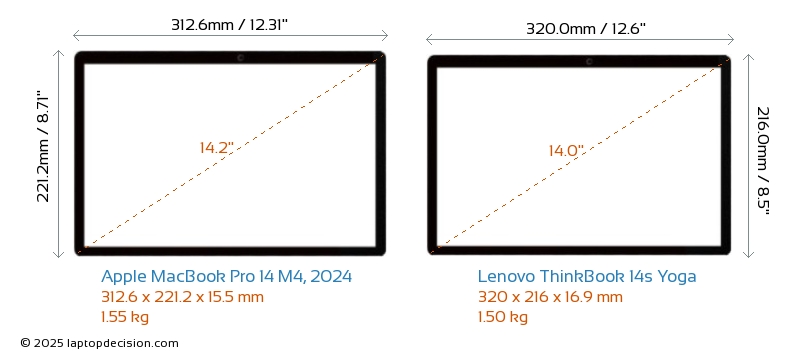HDMIBoth MacBook Pro 14 M4, 2024 and ThinkBook 14s Yoga feature an HDMI port. MacBook Pro 14 M4, 2024 offers 1x HDMI 2.1, while ThinkBook 14s Yoga offers 1x HDMI 2.0.