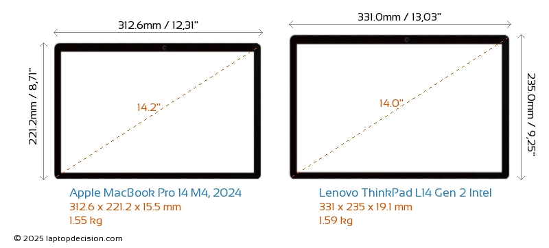 HDMIBoth MacBook Pro 14 M4, 2024 and ThinkPad L14 Gen 2 Intel feature an HDMI port. MacBook Pro 14 M4, 2024 offers 1x HDMI 2.1, while ThinkPad L14 Gen 2 Intel offers 1x HDMI 2.0.