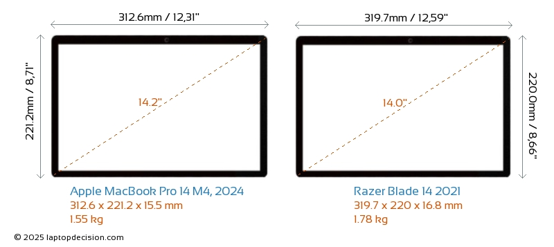 Audio JackBoth MacBook Pro 14 M4, 2024 and Blade 14 2021 are equipped with a 3.5mm Audio Jack, providing seamless connection to headphones and speakers.