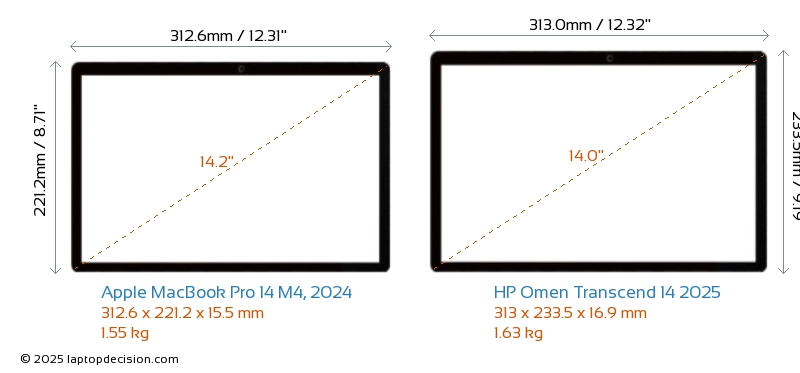 Audio JackBoth MacBook Pro 14 M4, 2024 and Omen Transcend 14 2025 are equipped with a 3.5mm Audio Jack, providing seamless connection to headphones and speakers.
