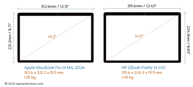 HDMIBoth MacBook Pro 14 M4, 2024 and ZBook Firefly 14 G10 feature an HDMI port. MacBook Pro 14 M4, 2024 offers 1x HDMI 2.1, while ZBook Firefly 14 G10 offers 1x HDMI 2.0.