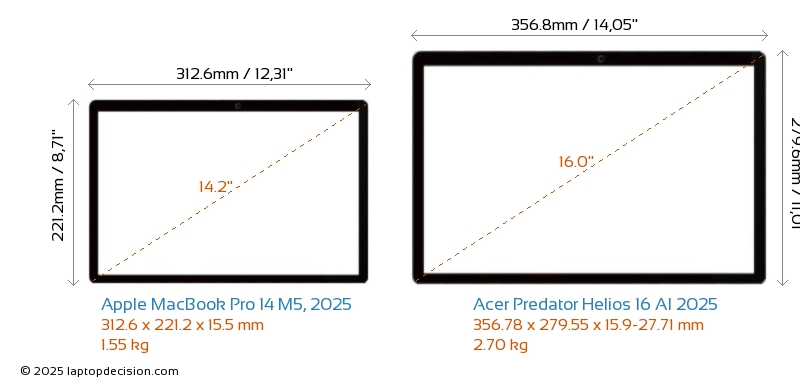 HDMIBoth MacBook Pro 14 M5, 2025 and Predator Helios 16 AI 2025 feature an HDMI port (1x HDMI 2.1) for connecting to external monitors.