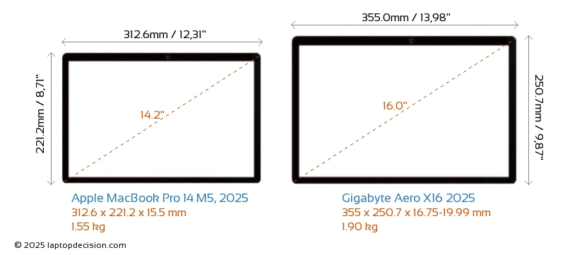 HDMIBoth MacBook Pro 14 M5, 2025 and Aero X16 2025 feature an HDMI port (1x HDMI 2.1) for connecting to external monitors.