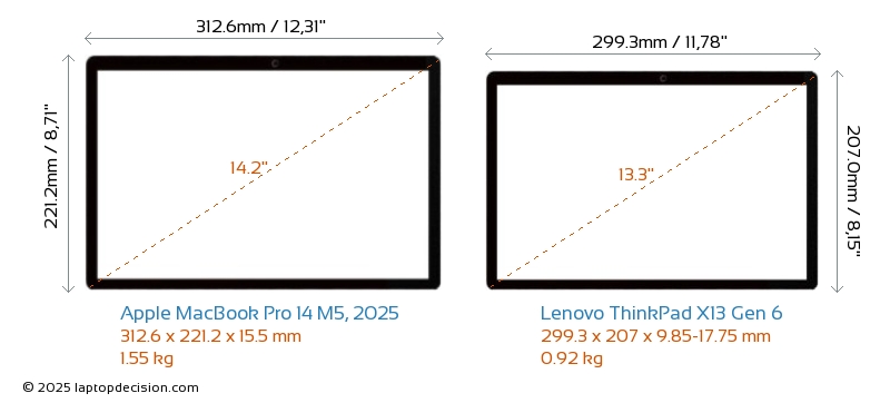 Audio JackBoth MacBook Pro 14 M5, 2025 and ThinkPad X13 Gen 6 are equipped with a 3.5mm Audio Jack, providing seamless connection to headphones and speakers.