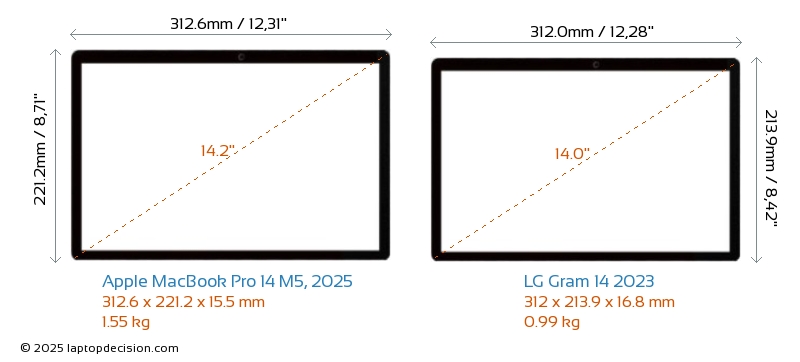 HDMIBoth MacBook Pro 14 M5, 2025 and Gram 14 2023 feature an HDMI port. MacBook Pro 14 M5, 2025 offers 1x HDMI 2.1, while Gram 14 2023 offers 1x HDMI 2.0.