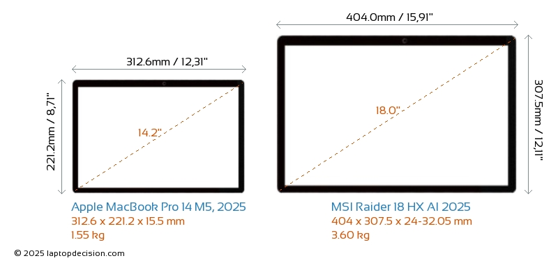 HDMIBoth MacBook Pro 14 M5, 2025 and Raider 18 HX AI 2025 feature an HDMI port (1x HDMI 2.1) for connecting to external monitors.