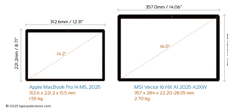 HDMIBoth MacBook Pro 14 M5, 2025 and Vector 16 HX AI 2025 A2XW feature an HDMI port (1x HDMI 2.1) for connecting to external monitors.
