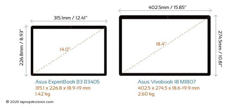 USBBoth ExpertBook B3 B3405 and Vivobook 18 M1807 feature 2x USB 3.2 USB-A ports.Both ExpertBook B3 B3405 and Vivobook 18 M1807 feature 2x USB 4.0 USB Type-C ports.