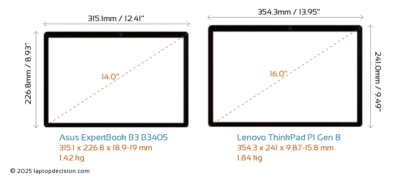 USBBoth ExpertBook B3 B3405 and ThinkPad P1 Gen 8 have USB-A ports. ExpertBook B3 B3405 has 2x USB 3.2 USB-A ports, while ThinkPad P1 Gen 8 has 1x USB 3.2 USB-A ports.Both ExpertBook B3 B3405 and ThinkPad P1 Gen 8 have USB Type-C ports. ExpertBook B3 B3405 has 2x USB 4.0 USB Type-C ports, while ThinkPad P1 Gen 8 has 3x USB 4.0 USB Type-C ports.