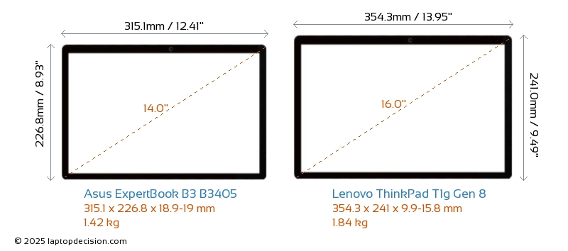 Wifi ThinkPad T1g Gen 8 features a more advanced Wi-Fi standard v7, providing faster and more reliable wireless connections compared to ExpertBook B3 B3405 (v6E).