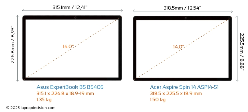 SD Card Reader ExpertBook B5 B5405 is equipped with an SD Card Reader for easy access to memory cards. Aspire Spin 14 ASP14-51 does not have an SD Card Reader.