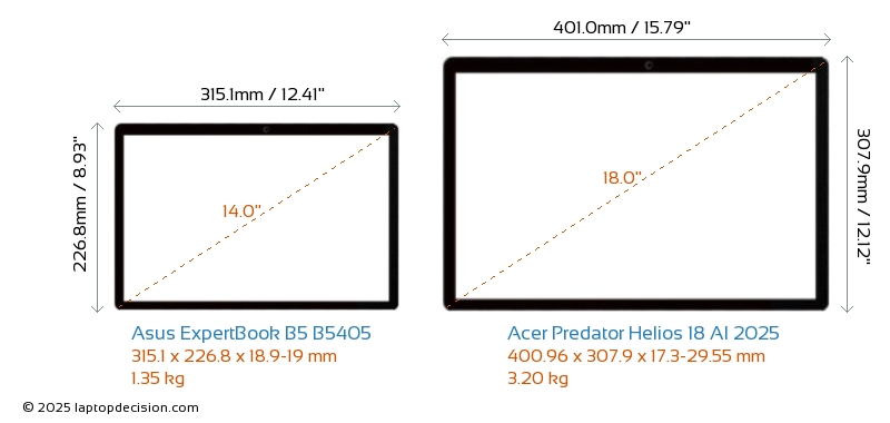 USBBoth ExpertBook B5 B5405 and Predator Helios 18 AI 2025 have USB-A ports. ExpertBook B5 B5405 has 2x USB 3.2 USB-A ports, while Predator Helios 18 AI 2025 has 3x USB 3.2 USB-A ports.Both ExpertBook B5 B5405 and Predator Helios 18 AI 2025 feature 2x USB 4.0 USB Type-C ports.
