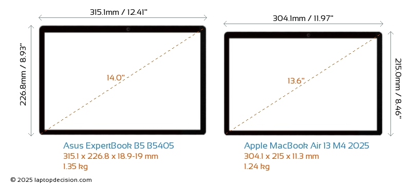 USB ExpertBook B5 B5405 is equipped with 2x USB 3.2 USB-A ports. MacBook Air 13 M4 2025 does not have USB-A ports.Both ExpertBook B5 B5405 and MacBook Air 13 M4 2025 feature 2x USB 4.0 USB Type-C ports.