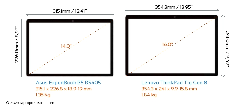USBBoth ExpertBook B5 B5405 and ThinkPad T1g Gen 8 have USB-A ports. ExpertBook B5 B5405 has 2x USB 3.2 USB-A ports, while ThinkPad T1g Gen 8 has 1x USB 3.2 USB-A ports.Both ExpertBook B5 B5405 and ThinkPad T1g Gen 8 have USB Type-C ports. ExpertBook B5 B5405 has 2x USB 4.0 USB Type-C ports, while ThinkPad T1g Gen 8 has 3x USB 4.0 USB Type-C ports.