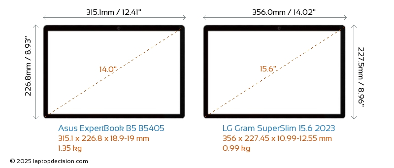 HDMI ExpertBook B5 B5405 features an HDMI port (1x HDMI 2.1) for connecting to external monitors. Gram SuperSlim 15.6 2023 does not have an HDMI port.