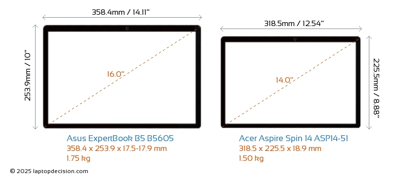 SD Card Reader ExpertBook B5 B5605 is equipped with an SD Card Reader for easy access to memory cards. Aspire Spin 14 ASP14-51 does not have an SD Card Reader.