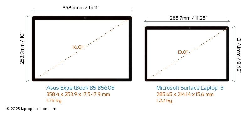 HDMI ExpertBook B5 B5605 features an HDMI port (1x HDMI 2.1) for connecting to external monitors. Surface Laptop 13 does not have an HDMI port.