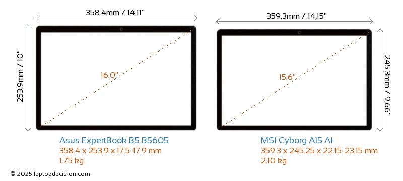 HDMIBoth ExpertBook B5 B5605 and Cyborg A15 AI feature an HDMI port (1x HDMI 2.1) for connecting to external monitors.