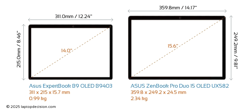 USBBoth ExpertBook B9 OLED B9403 and ZenBook Pro Duo 15 OLED UX582 feature 1x USB 3.2 USB-A ports.Both ExpertBook B9 OLED B9403 and ZenBook Pro Duo 15 OLED UX582 have USB Type-C ports. ExpertBook B9 OLED B9403 has 2x USB 4.0 USB Type-C ports, while ZenBook Pro Duo 15 OLED UX582 has 2x USB 3.2 USB Type-C ports.