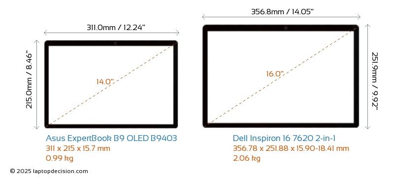 HDMIBoth ExpertBook B9 OLED B9403 and Inspiron 16 7620 2-in-1 feature an HDMI port. ExpertBook B9 OLED B9403 offers 1x HDMI 2.1, while Inspiron 16 7620 2-in-1 offers 1x HDMI 1.4.